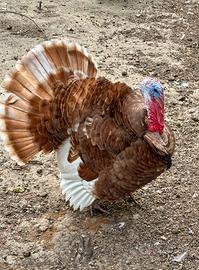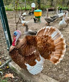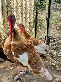 Disponibile bellissima coppia adulta di tacchini rossi di Borbone, razza originale e riprodotti e allevati in purezza, coppia di 2 anni di età, maschio e femmina sono non consanguinei tra di loro, quindi ottimi per la riproduzione, la coppia depone le uova regolarmente, la femmine ogni fine ciclo produttivo entra in cova, a già covato 2/3 volte con buoni risultati sulla schiusa, il maschio quindi è molto fertile, si cedono solamente in coppia visto che sono rimasti solo loro due da cedere, allevati sempre con ottime granaglie e liberi fuori quindi animali molto rustici e ben adattati a stare inverno ed estate fuori, foto logicamente veritiere e fatte da me in persona appositamente per fare l'annuncio, il prezzo della coppia è di 150 euro non trattabili, perché sono animali adulti e di razza pura, quindi non si svalutano per nessuno, evitare perdite di tempo e altri commenti inutili, scrivere solamente se interessati all'acquisto degli animali e sarò disponibile a rispondere alle vostre domande, grazie e buon proseguimento.