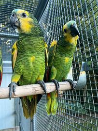 Disponibili coppie di Amazzoni a fronte blu ali gialle (Amazona aestiva xanthopteryx) allevate a mano e dai genitori, non consanguinee. Esemplari provenienti dalle principali linee di sangue in Europa (Forsberg, Zonneveld, etc.), muniti di anello chiuso, certificato di sessaggio, certificato veterinario di buona salute ed in regola con la normativa Cites. Possibilità di consegna gratuita lungo il percorso Pescara-Bologna-Padova-Udine o, con un piccolo contributo spese, verso le altre destinazioni, isole comprese.