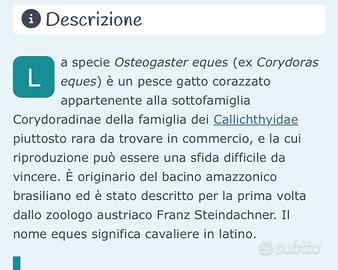 Vendo una specie di corydoras abbastanza rara, che ho acquistato su un sito di acquariofilia e poi che ho riprodotto nel mio acquario. Si vendono i piccoli quando saranno pronti tra circa un mese.. Si possono già prenotare da ora. Allego le foto di altri individui giovani e adulti nel mio acquario Prima di acquistare dei pesci informatevi bene sulle loro necessità, compatibilità ecc. grazie.