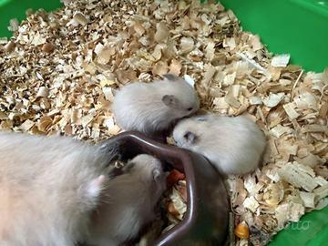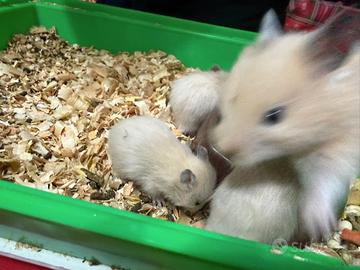 Vendo criceti dorati, nati il 1 dicembre 2025, mangiano e bevono soli, in foto è presente la mamma pure, ideali per bambini non mordono, 4€ ciascuno e 10€ 3 criceti