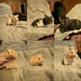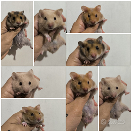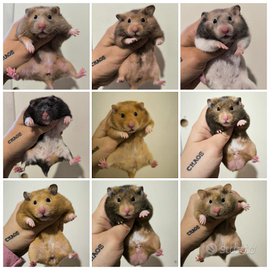 Disponibili criceti dorati o siriani di colori particolari, (colore crema, bicolore, dorato, tricolore, grigio, blu, brindle, crema, cinnamon, cioccolato,.. )maschi e femmine molto docili affettuosi e abituati al contatto umano, non mordono scriverci per disponibilità, prezzo in base a colore a partire da 20
