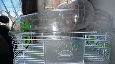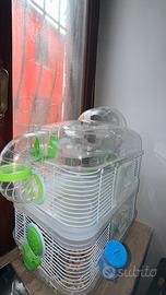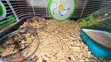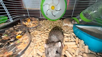 Vendo due criceti piccoli (maschio e femmina), quindi ancora addomesticabili. Insieme vendo la gabbia, il mangime, la sabbia igienica, le ciotole per mangiare e per la sabbia igienica l'abbeveratoio, quindi tutto ciò che vedete in foto.