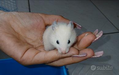 Disponibili per il ritiro da subito cuccioli di criceto dorato europeo disponibili sia maschi che femmine. Sono tutti a pelo corto colorazioni bianchi beige e arancioni. Hanno un prezzo modico SONO ALLEVATI A CASA E ABITUATI AL CONTATTO UMANO OGNI GIORNO SIA DA UN ADULTO CHE BAMBINO NON MORDONO RAZZA SPETTACOLARE OTTIMI PER LA COMPAGNIA SIA PER ADULTI CHE BAMBINI OTTIMA RAZZA PER LA COMPAGNIA NON SONO ANIMALI IMPEGNATIVI SONO IN PERFETTA SALUTE. COSI BELLI E COSI PICCOLI CUCCIOLI NON I TROVANO FACILMENTE GENITORI NON CONSANGUINEI!!! CHIAMARE O SMS AL 3791459776 NO PERDITEMPO GRAZIE SOLO AMANTI DI ANIMALI