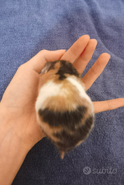 Abbiamo tre hamster. Uno è di colore cannella, e gli altri due sono di colore mucca giallo. Uno ha un viso particolare, e l'altro ha una trama sulla schiena particolare. Tutti hanno un carattere molto docile.
