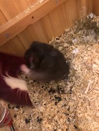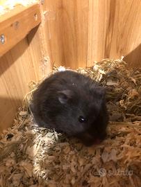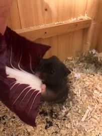 Criceta femmina di 5 mesi, dolce e non mordace. Mantello nero con una macchia bianca (vedi in foto). Abituata al contatto umano. Cerco per lei una casa amorevole.