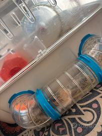 Il mio criceto è della razza Roborovski, piccolo, vivace e molto simpatico: o Molto coccoloso - ama essere accarezzato e star vicino a te. o Giocatore e curioso - adora correre nella gabbia, esplorare i tubi e divertirsi con la ruota. o Velocissimo - incredibilmente agile ed energico! o Affettuoso e socievole - perfetto come piccolo amico da osservare e coccolare. Può essere venduto insieme alla gabbia completa e agli accessori (cibo, sabbia, paglia, ruota, tubi) oppure separatamente.
