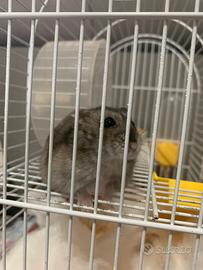 Vendo criceto russo con gabbia, segatura e mangime. Criceto attivo e curioso.