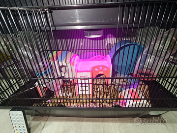 Inclusa gabbia grande a 2 piani di marca Voltrega, in ottime condizioni, completa di tubi trasparenti per il passaggio tra i piani e tanti accessori per il divertimento del criceto.