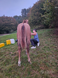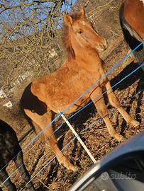 Puledro nato a maggio 2025 da mamma pezzata grossa taglia (visibile) e papà Criollo di razza.