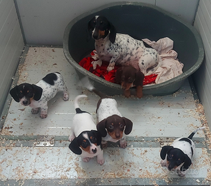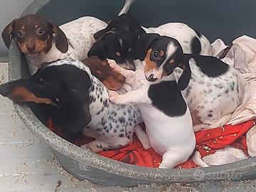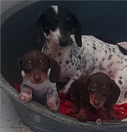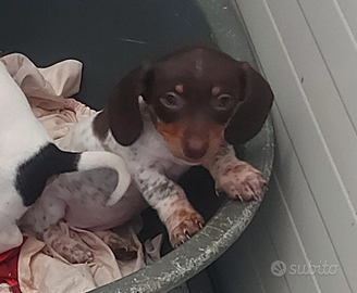 ?ellissima e simpaticissiima cucciola di bassotto piebald cioccolato con ticking nata il 5/10/25 e subito disponibile con 3 vaccini, chip, libretto sanitario , certificato di buona salute, trattamenti antiparassitari eseguiti e certificato di origine ;