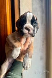 Cucciola boxer di altissima qualità, disponibile una femmina fulva con macchie bianche, nata il 26 dicembre 2025, cedibile dal 24 febbraio. Genitori di alta genealogia con esami sanitari ufficiali perfetti, Dna depositato, entrambi visibili in allevamento, il papà è pluri campione giovane di bellezza.