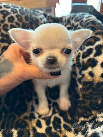 Disponibile Chihuahua femmina di due mesi, crema a pelo corto. Si consegna a tre mesi, con 3 sverminazioni, vaccini, microchip inserito, trattamento antiparassitario, visita veterinaria con analisi feci e test giardia effettuati appena prima di andare nella nuova famiglia, pedigree Enci e kit cucciolo. I genitori hanno ecocardio nella norma, e sono esenti da lussazione della rotula e oculopatie ereditarie.
