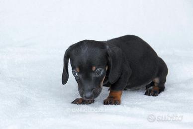 Ecco a voi Matilda (nome indicativo), la nostra dolce femminuccia di razza Bassotto in cerca di una nuova famiglia. Ha 2 mesi di età e un bellissimo pelo corto e liscio color nero focato. Matilda è intelligente, tenera e affettuosa, ma con il classico spirito coraggioso dei Bassotti: nella sua testa è convinta di essere un "Alano" e sarebbe pronta a sfidare persino un tirannosauro se lo incontrasse :D