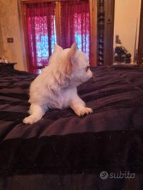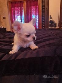 Splendida cucciolata di chihuahua toy genitori visibili di mia proprietà nata il 24 gennaio,total white di lina russa ,stop corto perfetto ,testa a mela,abituata in casa a sporcare sulla traversina, dolcissima, affettuosa rimarra da adulta 1,5 kg si cede con sverminazioni, vaccino microchip passaggio di proprietà incluso contatto telefonico 3791459776