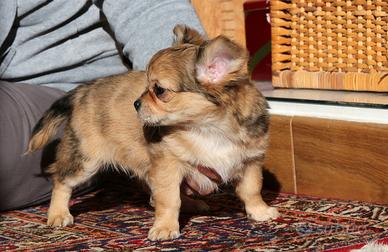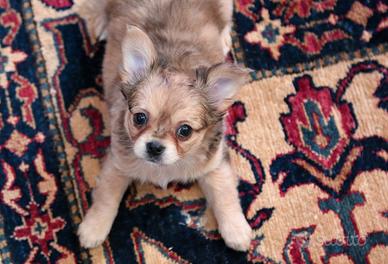 Bellissima femmina di chihuahua Femmina Fulvo merlé Pelo lungo Mamma merlé pelo lungo Papà fulvo pelo lungo Nata il 18.11 Contattatemi per video ed info Siamo a Caserta