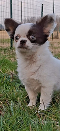 Bellissima cucciola di chihuahua, nata il 30 novembre, cresciuta in casa con la mamma, abituata alla traversina e al giardino. Una ventata di allegria e bellezza, ha gli occhi verdi ed è sempre pronta a giocare e a farsi coccolare. Ha fatto il primo vaccino e il microchip.