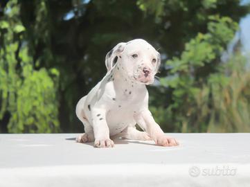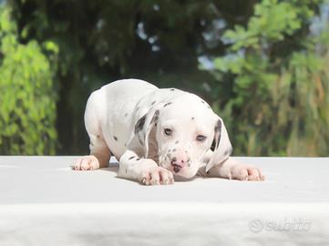 Disponibile cucciola di Dalmata di 2 mesi, allevata con attenzione e già parzialmente abituata a usare la traversina. Zaria (nome indicativo). Sguardo curioso e suo carattere allegro.
