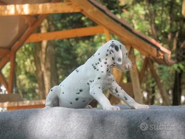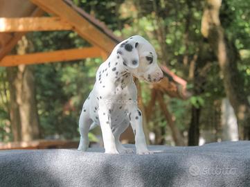 Questa stupenda cucciola di Dalmata bianca e nera si chiama (indicativamente) Briciola. Ha circa 65 giorni di età, ed è prontissima per trasferirsi in una nuova casa. La piccola è nata nel nostro allevamento. Caratterialmente, come tutti i cuccioli di Dalmata è divertente, socievole ed affettuosa; è quindi perfetta per tutta la famiglia.