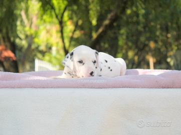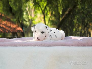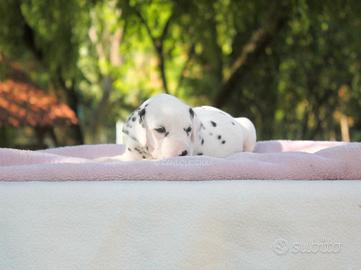 Piuma (nome indicativo) è questa femminuccia di Dalmata nata nel nostro allevamento, pronta per iniziare una nuova avventura. Il suo manto bianco decorato con affascinanti macchioline nere è uno spettacolo per gli occhi, mentre il suo carattere affettuoso e giocoso rende ogni giorno speciale. La piccola ha 2 mesi di età e ha il pedigree ENCI.