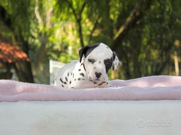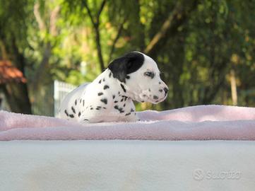 Con orgoglio vi presentiamo Alba (nome indicativo), femminuccia di Dalmata di 2 mesi di età nata nel nostro allevamento e subito disponibile . Con il suo spettacolare manto bianco punteggiato di macchie nere, brilla per la sua personalità dolce e tranquilla.