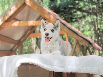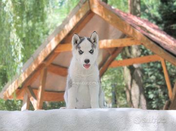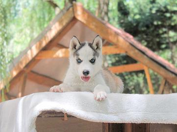 Lei è Kalia (nome indicativo), bellissima femminuccia di Siberian Husky di colore bianco e grigio sfumato di 2 mesi di età. La piccola è sempre pronta al gioco e al divertimento.