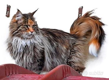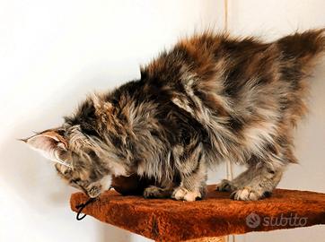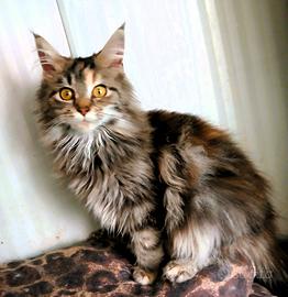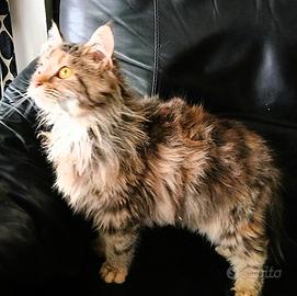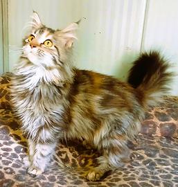 Dolcissima cucciola di Maine Coon, è una femminuccia di 4 mesi con il mantello brown tortie con caldi riflessi rossi e occhi ambrati. Nell'ultima foto c'è la mamma per vedere come diventerà da grande. Ha un carattere molto socievole e affettuoso, fa subito le fusa e cerca sempre carezze. E' abituata a vivere in casa utilizzando sabbietta e tiragraffi. Viene ceduta con libretto sanitario, vaccinata e sverminata