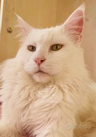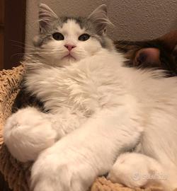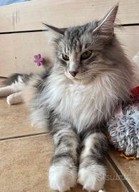 Cucciola di Maine Coon cerca casa.Nata il 20 settembre.Completamente svezzata,abituata all'uso della lettiera e del tiragraffi...solo amanti animali.No pedigree .Papà bianco ,mamma silver tabby nelle foto