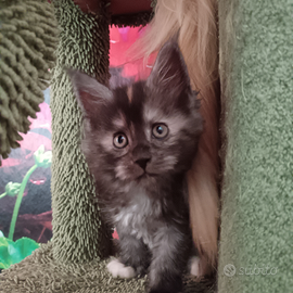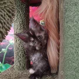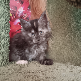 Bellissima e dolce cucciola di Maine Coon è disponibile per l'adozione. Verrà ceduta a 3 mesi con vaccinazioni, sverminazione, antiparassitario, test dei genitori negativi per HCM, HCM A31, PKD, pk def, atrofia muscolare spinale e atrofia retinica, ecocardio. Pedigree, visita veterinaria prevendita con certificato di buona salute e contratto di cessione e kit di benvenuto.