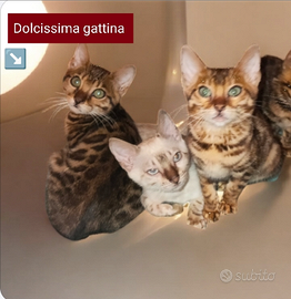 Dolcissima gattina del Bengala, età 3 mesi pronta a trovare una nuova casa piena di coccole.. Adozione solo a persone affidabili e amorevoli Siamo in Abruzzo Tortoreto Se seriamente interessati, vi prego di contattare: 3804515922