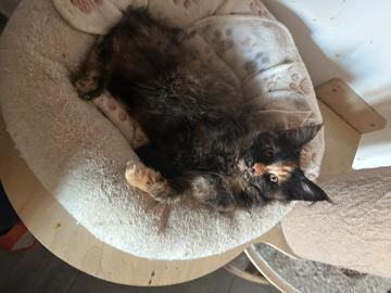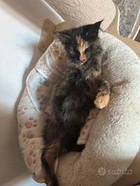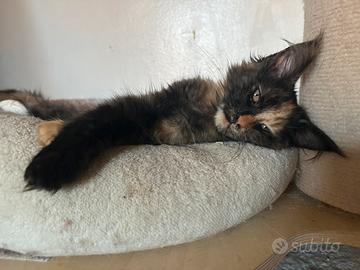 Ultima cucciola Maine coon nata il 22/12/25 Tricolore carattere alla ricerca del contatto umano ma non ama essere presa in braccio e coccolata troppo!!!! Devota comunque ogni cucciolo può essere con carattere non morboso che non è un difetto!!!! Con pedigree wcf test dei genitori n/n visibili in allevamento e anche come presenta si può vedere mamma e papà!!!! Abituata a cani di piccola taglia bambini e altri gatti ottimo rapporto con cibo e tiragraffi e lettiera!!!! Visibile su appuntamento!!! Ceduta da compagnia a privati possibile valutazione a allevamento ogni info in privato!!!!