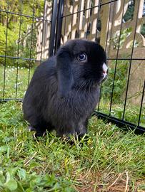 Disponibile splendida cucciola di razza Minilop, mantello di colore nero e occhi azzurri. Dettagli: Età: 3 mesi Trattamenti antiparassitari eseguiti Carattere: Docile, curiosa e abituata all'interazione sia con l'uomo che con altri animali come cani e gatti La piccola è pronta per raggiungere la sua nuova famiglia