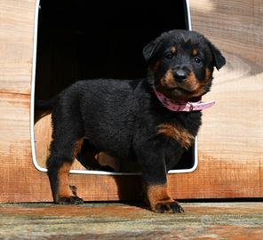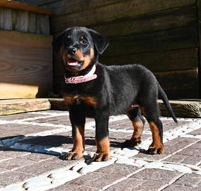 Cucciola BEAUCERON (Pastore di Beauce) nero focata "collare rosa" disponibile. nata il 4 Gennaio 2026, carattere e morfologia eccellenti, nessun difetto; genitori selezionati a livello morfologico e caratteriale, visibili presso di noi : Kiley Argentée des Gardiens de Rome HD A / ED 0 x CH. LEON des Gardiens de Rome HD A / ED 0 CAMPIONE ITALIANO RIPRODUTTORE