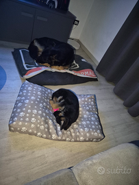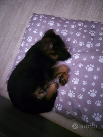 La cucciola è a pelo corto, nero focato, con maggiore pigmentazione scura su muso e dorso.