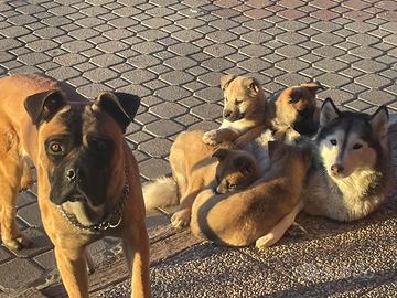 Bellissime Cucciole di husky intrecciate con cane corso.