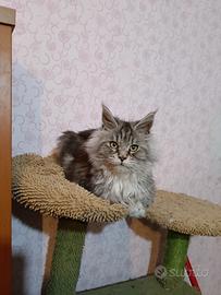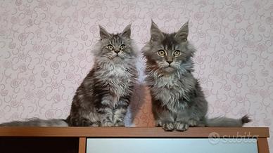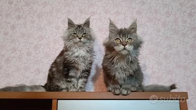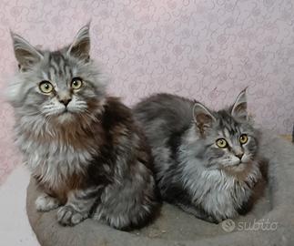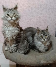 Dolcissime cucciole Maine coon disponibili, 2 femmine black silver tabby e 1 femmina blu silver tabby, nate il 26 giugno da genitori HCM N/N ed esenti fiv e felv.
