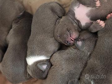 Cuccioli di American Pitbull Terrier nati il 10 marzo da Dea e Daiki. Disponibili 6 maschi e 5 femmine. I cuccioli stanno crescendo in ambiente controllato con attenzione alla gestione e alla socializzazione. Presenti diverse colorazioni, tra cui tonalità blue e blue brindle. Verranno affidati dopo il compimento dei 70 giorni con microchip, libretto sanitario, vaccinazione e sverminazioni effettuate. Genitori visibili. Per informazioni contattare in privato.