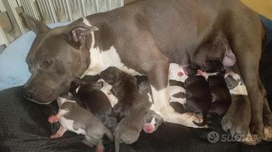 Bellissima cucciolata di Amstaf Blu, tigrati e neri, 5 maschi e 5 femmine hanno 20 giorni e saranno ceduti sverminati e vaccinati. I genitori mamma Wendy e babbo Kinder visionabili. X Info Antonio 3496092862.