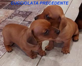 Disponibili cuccioli di Bassotto nano a pelo raso, colore fulvo (maschi e femmine). Cucciolata composta da 7 cuccioli: rimasto disponibile l'ltimo cucciolo fulvo maschio. La madre dei cuccioli è figlia di un esemplare vincitore di un titolo nazionale, discendente da pluripremiati campioni di bellezza europei e nazionali (comprovabile). Anche il padre è un esemplare selezionato (vedi focature). Tengo a precisare che non siamo un allevamento, ma semplicemente privati amanti della razza: nella nostra famiglia ci sono bassotti da oltre 40 anni. Nota sul colore del pelo: I cuccioli, essendo ancora molto piccoli, presentano un mantello non ancora definitivo. Crescendo, il colore si definirà assumendo la tonalità tipica (fulvo / nero focato). Per questo motivo sono presenti anche foto della cucciolata precedente. Il cucciolo verrà consegnato: vaccinato sverminato con libretto sanitario con microchip registrato all'anagrafe canina Nell'annuncio sono presenti foto dei cuccioli, della madre e del padre. Non limitatevi a guardare solo i cuccioli: sono i genitori a determinare come diventerà da adulto. Nati l'11 marzo - disponibili dall'11 maggio Prezzo: 530 (microchip incluso) (senza pedigree) Nota importante: Vista l'elevata richiesta, i cuccioli vengono riservati solo previo caparra. Questo per evitare perdite di tempo e dare priorità a chi è realmente interessato. Contatti: Telefono / WhatsApp: 347 795 9886 NO SMS Gianluca