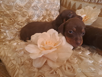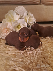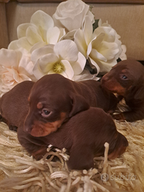 Disponibili bellissimi cuccioli di bassotti ciocccolato Kaninchen, genitori di mia proprieta' , i cuccioli saranno ceduti con sverminazione vaccino e libretto sanitario con certificato di buona salute ,per inf roberta massima serieta'.
