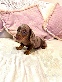 Allevamento 25ennale Sundoxie dispone di due cuccioli maschi di bassotto, un arlecchino chocolate e un chocolate, nati il 9 febbraio 2025.