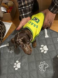 BASSOTTI TEDESCHI CUCCIOLI - SELEZIONE DI ALTO LIVELLO Disponibili splendidi cuccioli di Bassotto Tedesco a pelo corto, di alta genealogia, nelle taglie nana e kaninchen. Cuccioli selezionati, sani e seguiti con massima cura, affidati a circa 90 giorni con: o ciclo vaccinale completo o iscrizione anagrafe canina o pedigree ENCI o DNA depositato o test genetici o certificazione veterinaria Massima serietà e trasparenza: cuccioli, genitori e ambiente sempre visibili. Le cessioni e le prenotazioni avvengono esclusivamente dopo visita/colloquio conoscitivo. NO spedizioni tramite terzi. Possibile consegna diretta da parte dell'allevamento. Contattaci subito per informazioni o per fissare un incontro: il tuo bassotto ti aspetta. Paola Martini Allevamento DIENGEL'S - selezione Bassotto Tedesco
