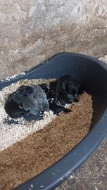 Disponibili cuccioli nati il 1 marzo 2026, 2 maschi e 2 femmine di cui 1 femmina grigio piombo e 2 maschi e 1 femmina neri. Genitori di proprietà visibili, contatto telefonico per informazioni, prezzo accessibile.