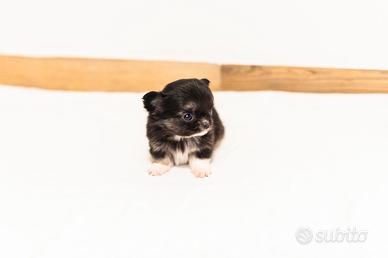 Disponibili bellissimi cuccioli di chihuahua pelo lungo, 1 femmina chocolate & tan taglia toy e 4 maschietti tricolor nero focato. Sono nati il 4/01/2026 e vengono ceduti dal 20/03/2026 con: sverminazione, visita veterinaria, primo vaccino, libretto sanitario, microchip e pedigree Enci.