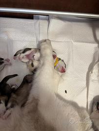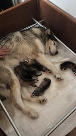 Disponibili 7 cuccioli di Alaskan Malamute nati il 02/04/2026 di colore grigio. Genitori esenti da displasie ed oculopatie. Verranno ceduti ad amanti della razza con microchip, iscrizione anagrafe canina, libretto sanitario, ciclo sverminazione, visita veterinaria e pedigree. Saranno ceduti dopo 65 giorni di vita. Disponibili 1 femmina e 4 maschi
