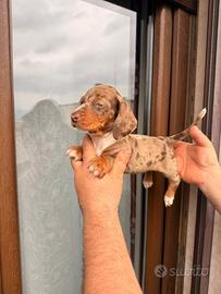 Disponibili meravigliosi cuccioli di bassotto color arlechino cioccolato ochi blu.I cuccioli sono nati in ambiente familiare e curati con attenzione.I cuccioli anno compiuto 60 giorni sono vaccinati e sverminati e godono di ottima salute.Genitori visibili sull posto taglia piccola.I cuccioli si rilasciano con libretto sanitario che include primo vaccino e 2 sverminazioni.Per info 3758620240 prezzo 850 disponibili solo maschi