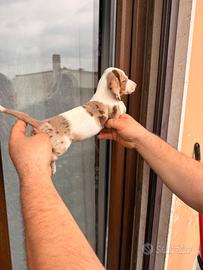 Disponibile da subito unici e meravigliosi cuccioli di bassotto arlecchino cioccolato ochi blu.Disponibile maschi. I cuccioli sono nati in ambiente familiare e curati con attenzione. I cuccioli anno compiuto 65 giorni sono vaccinati e sverminati e godono di ottima salute. Genitori visibili sull posto taglia piccola. I cuccioli si rilasciano con libretto sanitario che include primo vaccino e 2 sverminazioni. Per info 375 9050580 prezzo 850