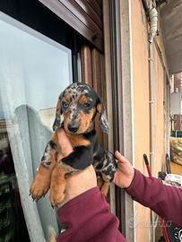 Disponibile da subito unici e meravigliosi cuccioli di bassotto arlecchino silver ochi blu. I cuccioli sono nati in ambiente familiare e curati con attenzione. I cuccioli anno compiuto 70 giorni sono vaccinati e sverminati e godono di ottima salute. Genitori visibili sull posto taglia piccola visibili sull posto.Per info 375 9050580 prezzo 700