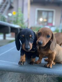 Cuccioli di bassotto tedesco nano pelo raso nati il 18 aprile svezzati,svermati, con 2 vaccini,microchip e libretto sanitario di sana costituzione.sono disponibili e maschietti di cui 2 fulvi 600 euro e uno arlecchino fulvo 750