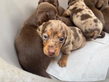 Disponibili bellissimi cuccioli di bassotto nano a pelo corto. Disponibili sia maschi che femmine sia nella colorazione cioccolato che Arlecchino ( solo maschi ). I genitori sono entrambi nani e visibili in loco con i cuccioli. Verranno consegnati con due cicli di vermifugo, vaccini, certificato di buona salute , puppy kit e microchip intestato al nuovo futuro proprietario non prima dei 70/90 giorni. È gradita la possibilità di venire a sceglierli di persona poiché non spedisco i miei cuccioli come pacchi regalo. Per qualsiasi informazione aggiuntiva video o foto contattate al numero 3486733021. Grazie