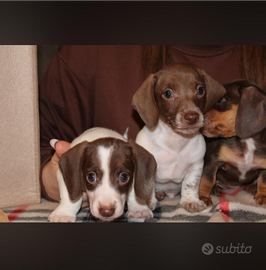 2 maschi e una femmina di bassotto colore piebald cioccolato, sono nati il 5 dicembre 2025 e sono pronti per lo loro nuova famiglia dalla seconda settimana di febbraio, si cedono sverminati, con 1 vaccino, microchip, libretto sanitario, certificato di buona salute. Genitori visibili.